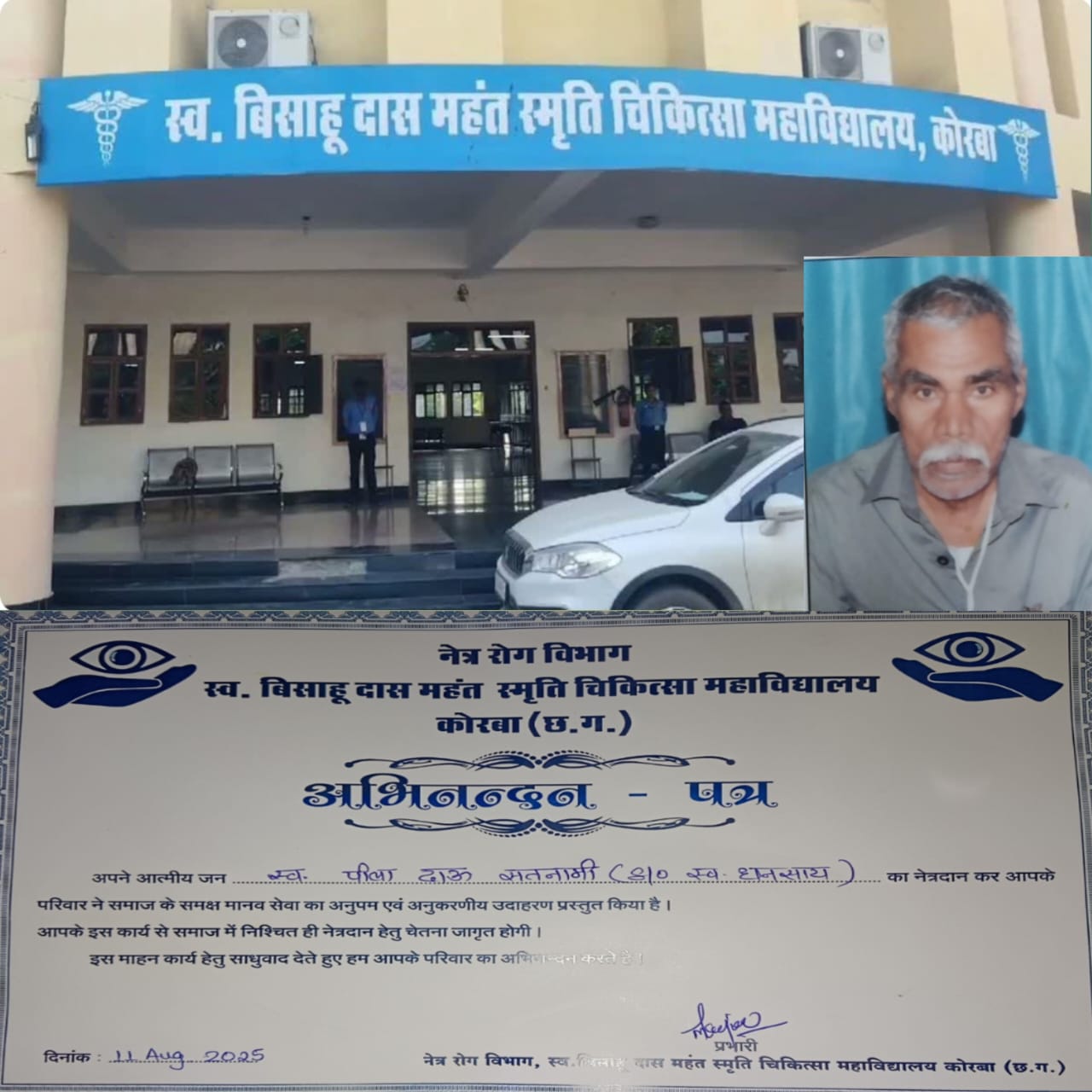 स्व. बिसाहू दास महंत स्मृति चिकित्सा महाविद्यालय, कोरबा को ग्राम पंचायत पचोरी के वरिष्ठ नागरिक पीलादाऊ सतनामी के निधन के बाद अपने पूरे शरीर को उनके परिजनों ने डोनेट कर दिया ताकि उनसे मेडिकल कॉलेज के डॉक्टर रिसर्च कर सकें या फिर उनके अंग दूसरों के काम आ सकें. हालांकि भारत में मृत्यु उपरांत देहदान बहुत कम है, उसे लेकर जागरूकता भी नहीं है. वैसे इस दान को महादान कहा गया है।